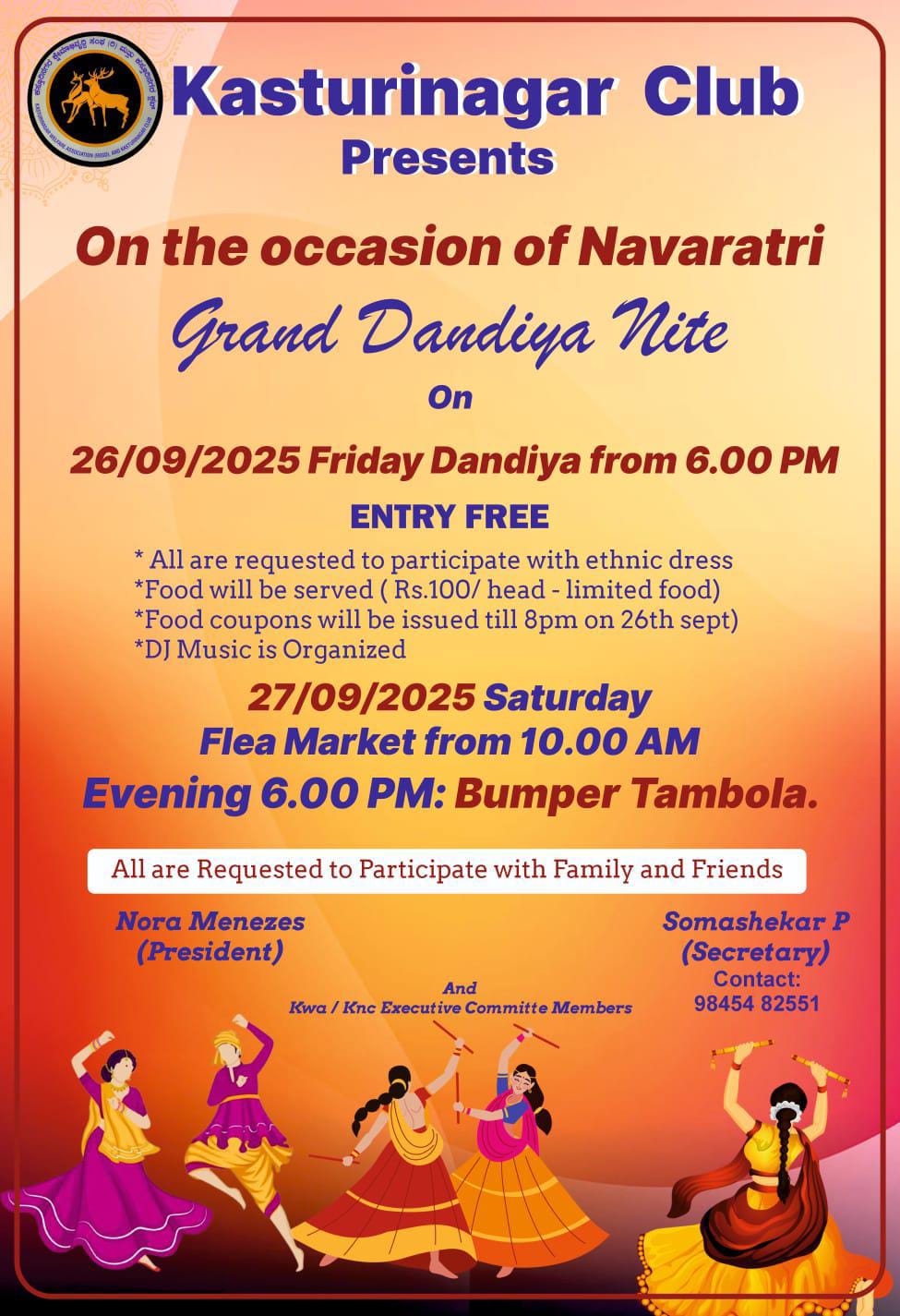 Dear Members, Residents, and Friends, On the joyous occasion of Navaratri, the Management and Cultural Committee of Kasturinagar Club has planned a series of exciting events. We warmly invite